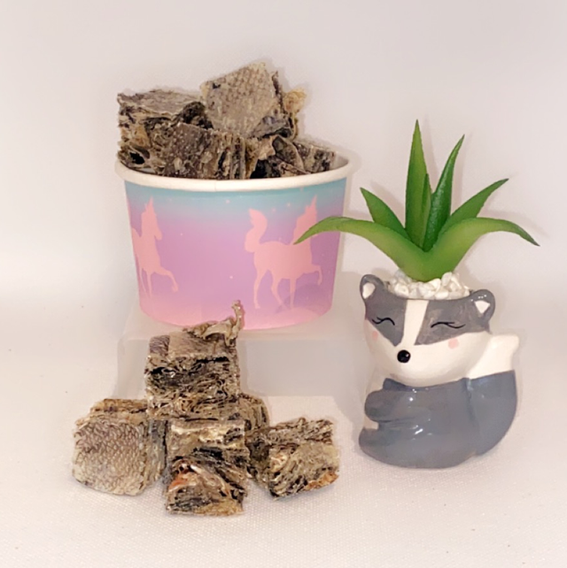 Healthy, natural, and delicious, these Fish Skin Cubes are an easily digestible treat, suitable for all ages. The rough texture helps to remove tartar and keep teeth healthy whilst the high proportion of high quality proteins, fats and oils are a great source of Omega 3!