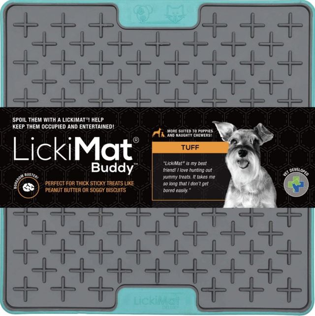 Authentic sLickiMat Buddy. Ideal for treats and coarse foods such as canned fish, wet food and raw food. Healthy and fun alternative to a slow feeder bowl. Available in many colours.
